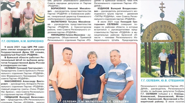 В июле 2021 года Геннадий СЕЛЕБИН совершил поездки по районам области, в которых встретился с руководителями представительств Партии «РОДИНА» в муниципальных районах Брянской области – членами Регионального Избирательного Штаба. Председатель Регионального отделения Партии «РОДИНА», руководитель Регионального Штаба по выборам депутатов ГосДумы Г.Г. СЕЛЕБИН посетил г. Клинцы, Климовский, Злынковский, Мглинский, Навлинский, Брасовский и Комаричский районы. В июне посетил Дятьковский, Брянский, Караческий, Выгоничский, Почепский, Унечский, Суражский и Красногорский районы Брянской области. Обсуждались вопросы организационной, агитационно-пропагандистской работы и оперативного сопровождения избирательной кампании в Государственную Думу РФ. Поставлена задача - подобрать на все УИКи наблюдателей для контроля голосования на выборах 17-19 сентября.