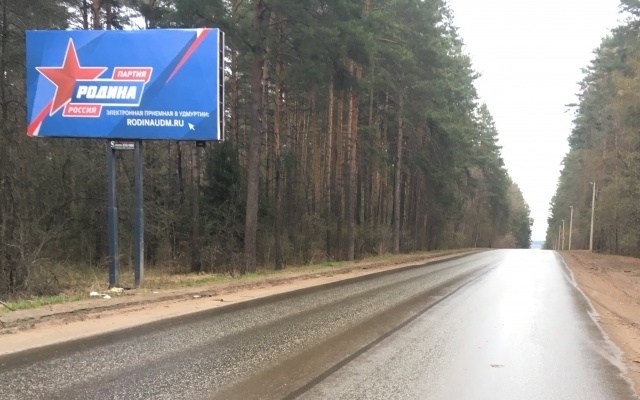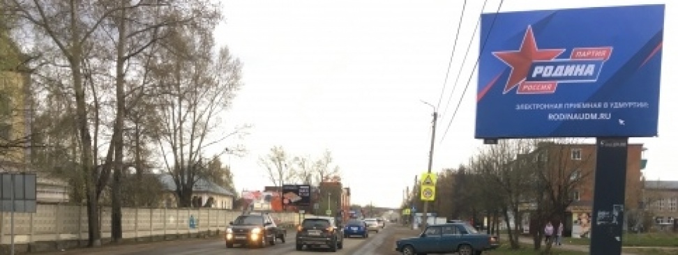 С 1 мая 2021 г. на въездах во все города Удмуртской Республики приезжающих встречают баннеры партии "РОДИНА". Порядка двадцати рекламных конструкций установлены на основных магистралях на подъездах к Ижевску, Сарапулу, Воткинску, Глазову и Можге. По самым скромным подсчетам, ежедневный трафик на этих участках составляет несколько десятков тысяч автомобилей жителей региона и гостей республики.