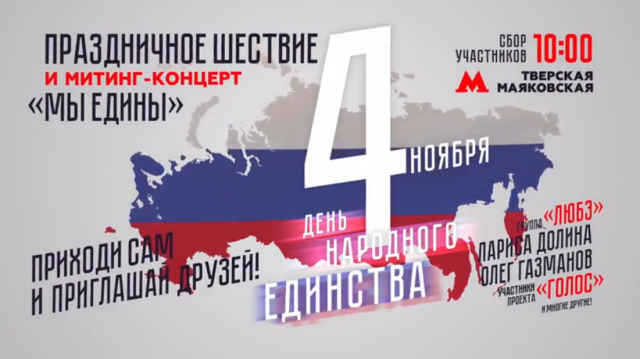 Шествие начнется от станции метро "Маяковская" 4 ноября в 10.30, затем колонна пройдёт по улице Тверская, повернёт на Театральный проезд до поворота на улицу Рождественка. В 11.00 там начнётся митинг-концерт "Мы едины".